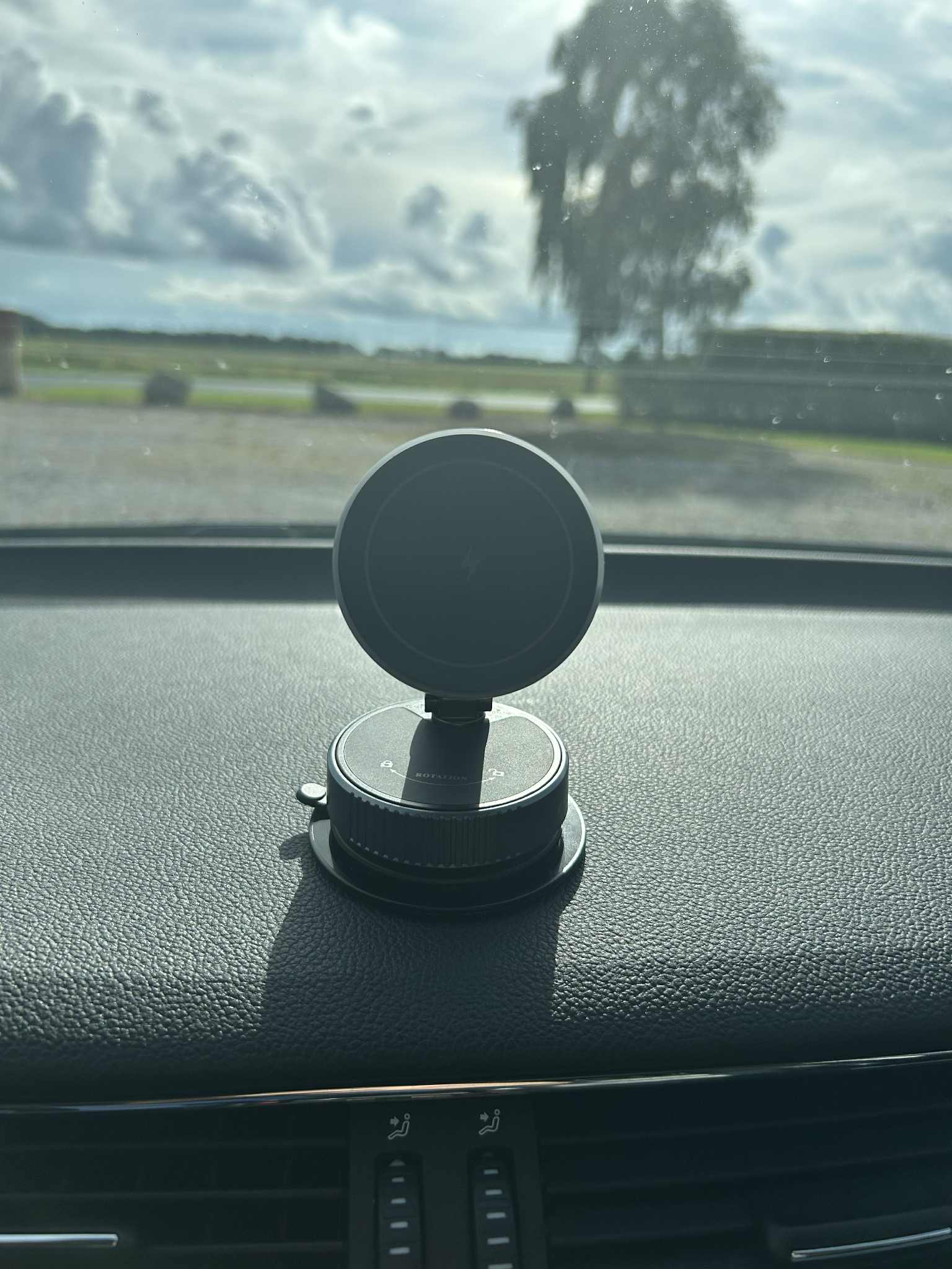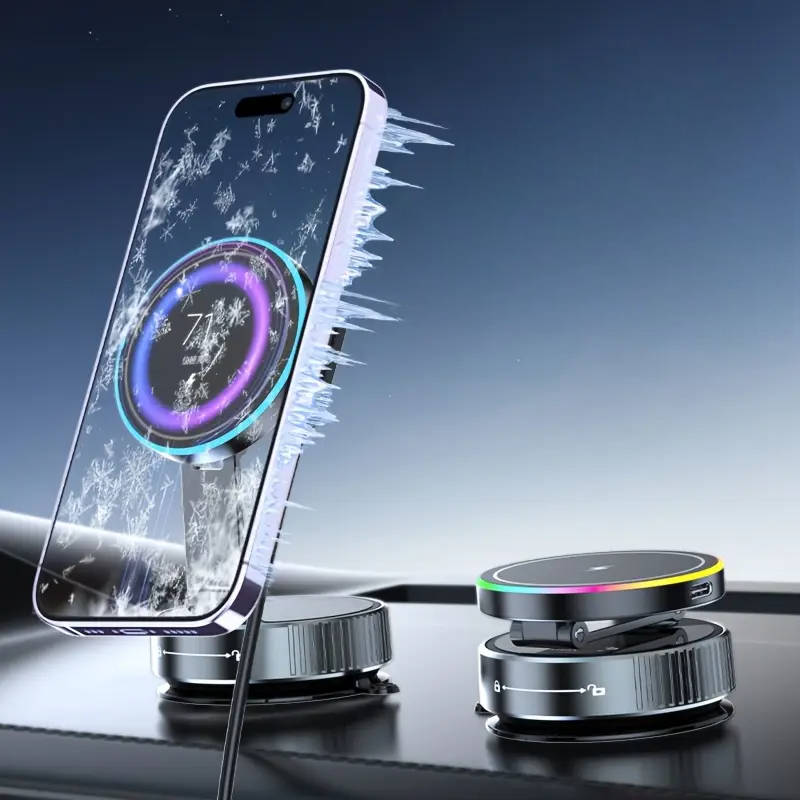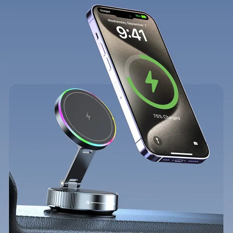 Mount the wireless charger onto the base plate by turning the bottom of the charger to the left until the suction cup securely locks onto the base plate.