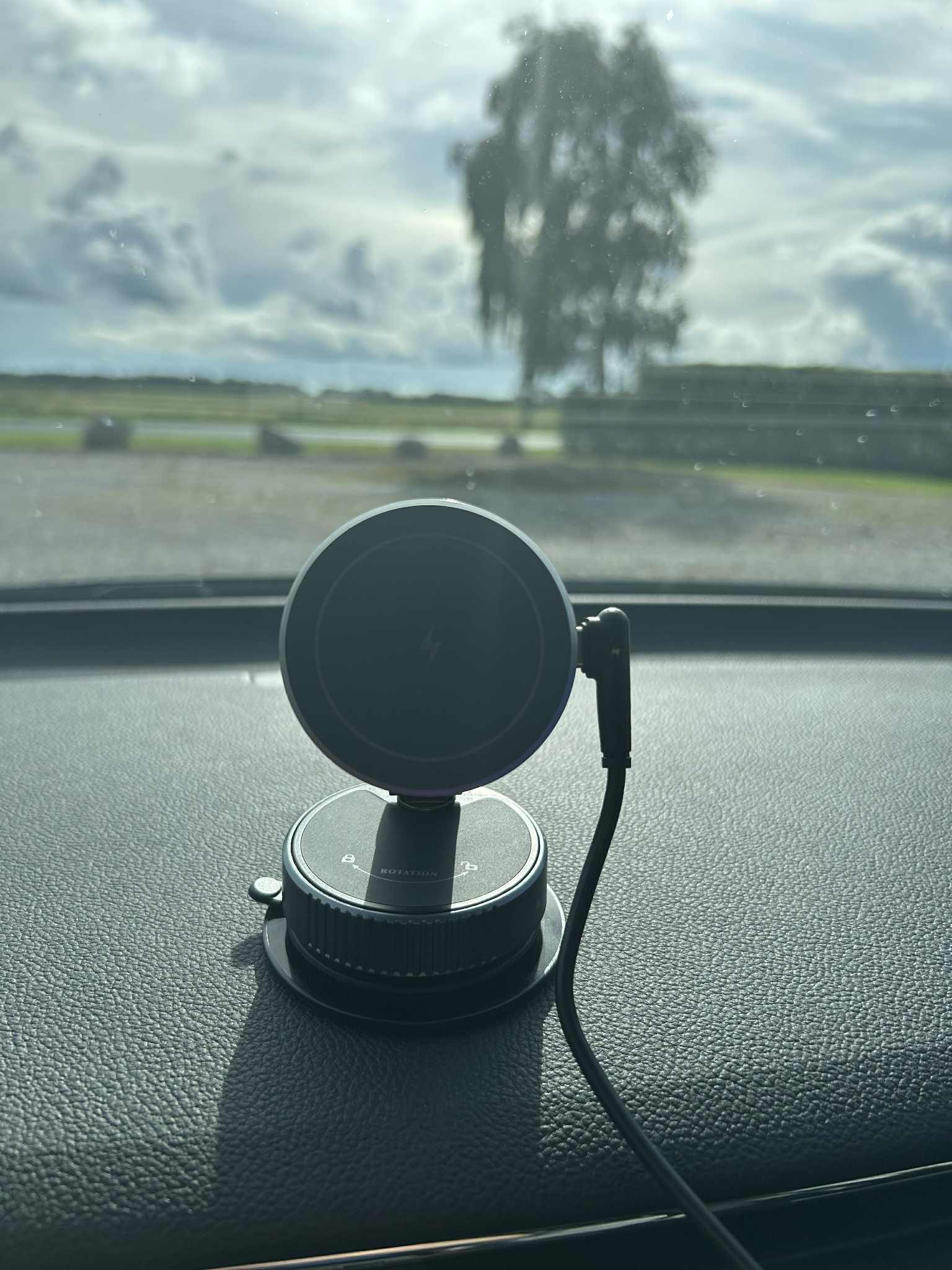 Mount the wireless charger onto the base plate by turning the bottom of the charger to the left until the suction cup securely locks onto the base plate.